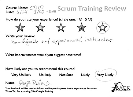 Knowledgeable Instructor By Scrum Training Review | April 27, 2018 | Comments Off on Knowledgeable Instructor Review: March 28, 2018 Knowledgeable and experienced instructor. Suggested improvements: See Handwritten Review Posted in 3Back, Certified Scrum Master and tagged St. Louis